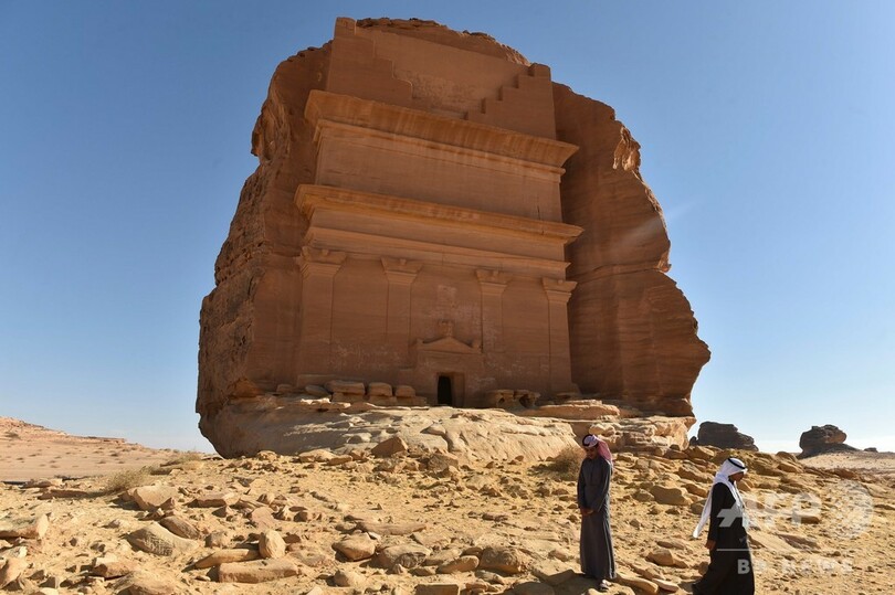 バラ色の砂岩に装飾施した巨大な墓石、サウジの世界遺産