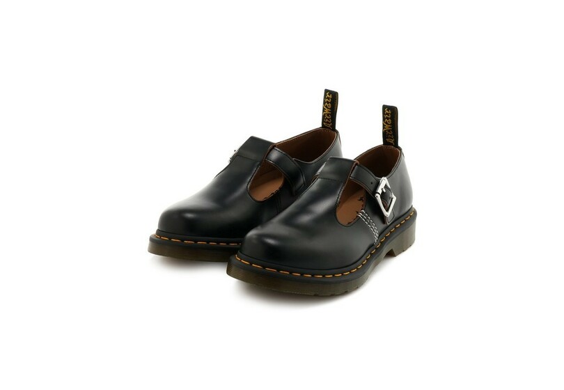 「ドクターマーチン」の「ポリー T バーシューズ」をベースに作られた本コラボモデルは、シューズサイドに入ったステッチがポイント。かかと部分に施された「Air Wair」タグは着脱をスムーズにするだけでなく、バックスタイルのアクセントにもなる。