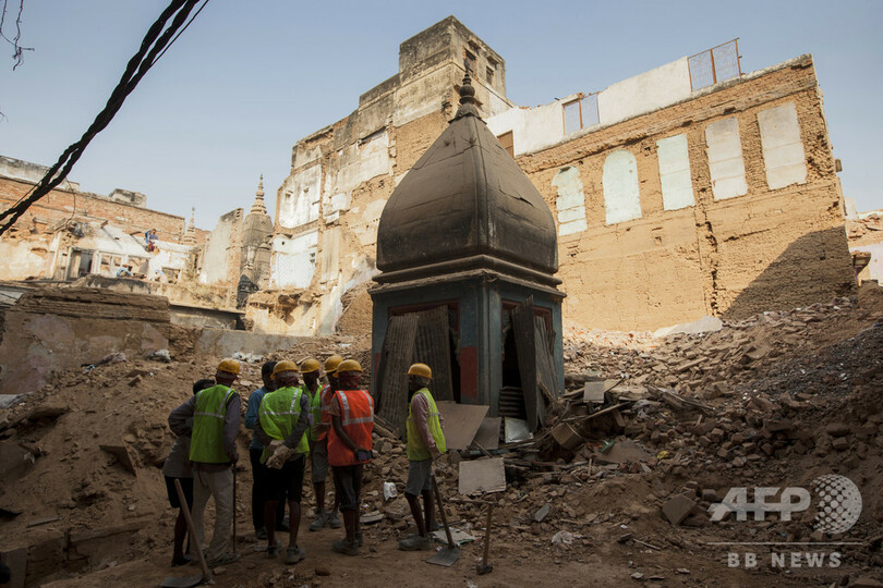 【1月25日 AFP】インドのウッタルプラデシュ(Uttar Pradesh)州バラナシ(Varanasi)のラホーリトーラ(Lahori Tola)地区の取り壊し作業中、ヒンズー教寺院遺跡の隣に集まるインド人作業員ら。古都バラナシは、著名寺院のカーシー・ビシュワナート寺院(Kashi Vishwanath Temple)の回廊を整備するためだとして周辺の旧市街地区や住宅をことごとく取り壊し、地元住民の怒りを買っている。(c)AFP