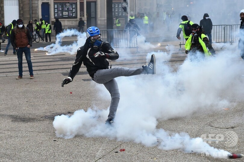 後にパリの凱旋(がいせん)門(Arc de Triomphe)でデモ参加者と治安部隊の小競り合いがあり、治安部隊は厳重な警備態勢が敷かれたシャンゼリゼ(Champs-Elysees)通りにデモ隊が到達しないよう催涙弾や放水車で対応した。