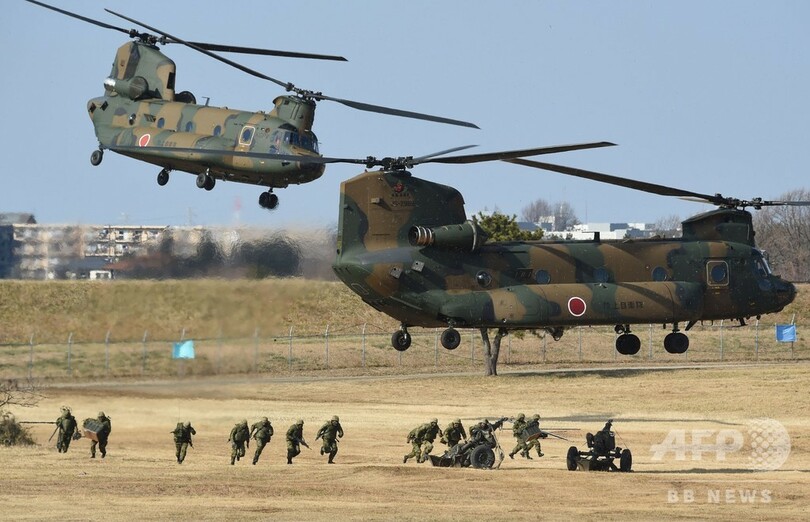 【1月14日 AFP】千葉県の陸上自衛隊習志野演習場で13日、陸上自衛隊の第1空挺団が降下訓練始めを行った。訓練には水陸両用車やヘリコプターが参加し、岩屋毅(Takeshi Iwaya)防衛相も視察に訪れた。(c)AFP