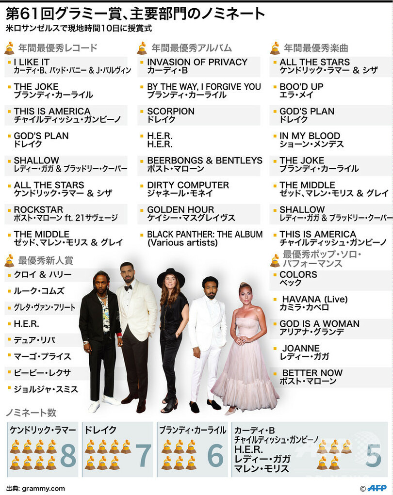 【2月9日 AFP】米カリフォルニア州ロサンゼルスで10日に予定されている第61回グラミー賞(Grammy Awards)授賞式。主要部門にノミネートされたミュージシャンや作品を図解でまとめた。