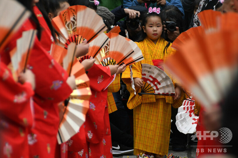 【1月15日 AFPBB News】豊漁・豊作、商売繁盛、家内安全を願って少女たちが舞う伝統行事「チャッキラコ」が1月15日、神奈川県三浦市で行われた。市内在住の5〜12歳の小学生ら25人が、赤や黄色の着物姿で扇をかざしながら、息の合った演舞を見せた。
