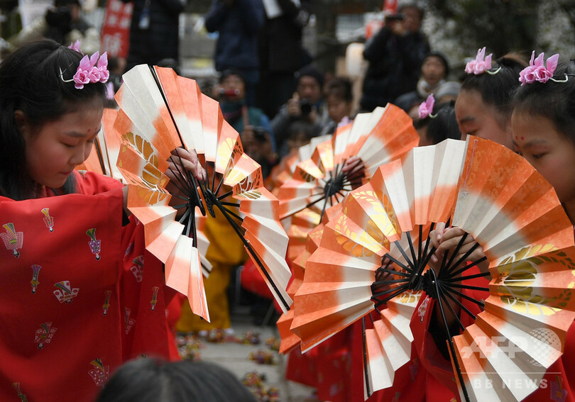 【1月15日 AFPBB News】豊漁・豊作、商売繁盛、家内安全を願って少女たちが舞う伝統行事「チャッキラコ」が1月15日、神奈川県三浦市で行われた。市内在住の5〜12歳の小学生ら25人が、赤や黄色の着物姿で扇をかざしながら、息の合った演舞を見せた。