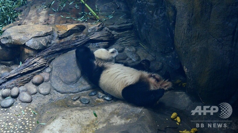 パンダのあられもない寝姿に、来場者はくぎ付けになっていた。(c)CNS/JCM/AFPBB News