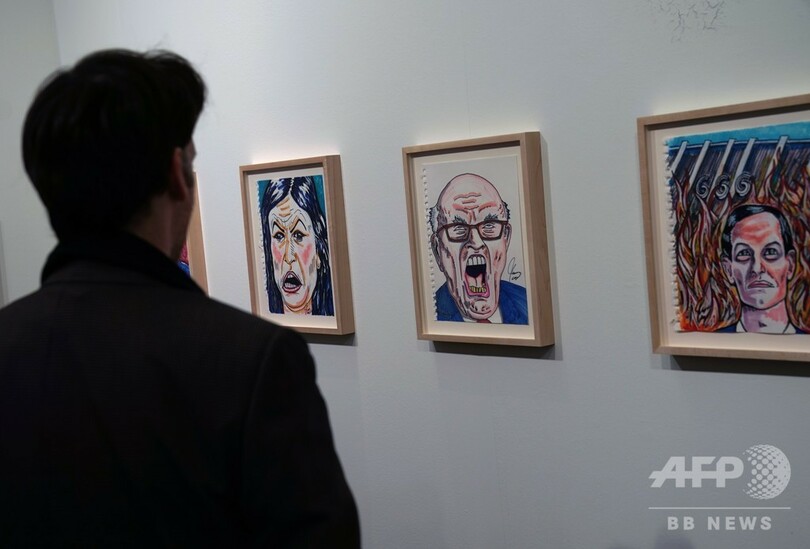 【1月24日 AFP】米ニューヨークのメトロポリタン・パビリオン(Metropolitan Pavilion)で開催された展覧会「アウトサイダー・アートフェア(Outsider Art Fair)」に、米俳優で政治風刺漫画家のジム・キャリー(Jim Carrey)さんの作品が出展された。キャリーさんは、アートを通じてドナルド・トランプ(Donald Trump)政権への抗議を行っている。(c)AFP