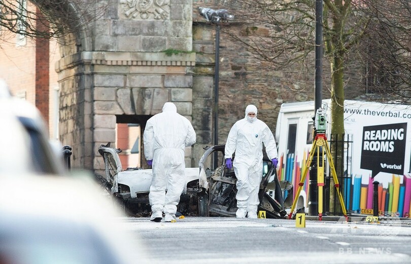 警察によると、攻撃に使われた車は事件当日、配送業者から強奪されたとみられる。爆発に先立ち、イングランド地方の慈善団体のホットラインに警告の電話があり、北アイルランドの警察に伝達されていた。(c)AFP