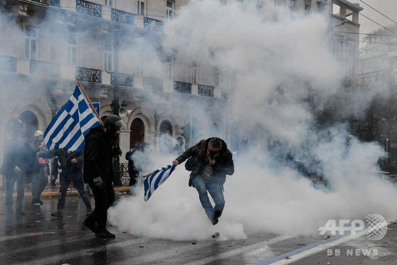 マケドニア国名変更、ギリシャで数万人がデモ 警察と衝突も
