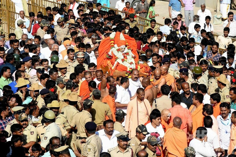 スワミ師の遺体はだいだい色の布と花輪で覆われ、人々に掲げられながら州都バンガロール(Bangalore)近郊の工業地区トゥムクル(Tumakuru)市内を巡回した。