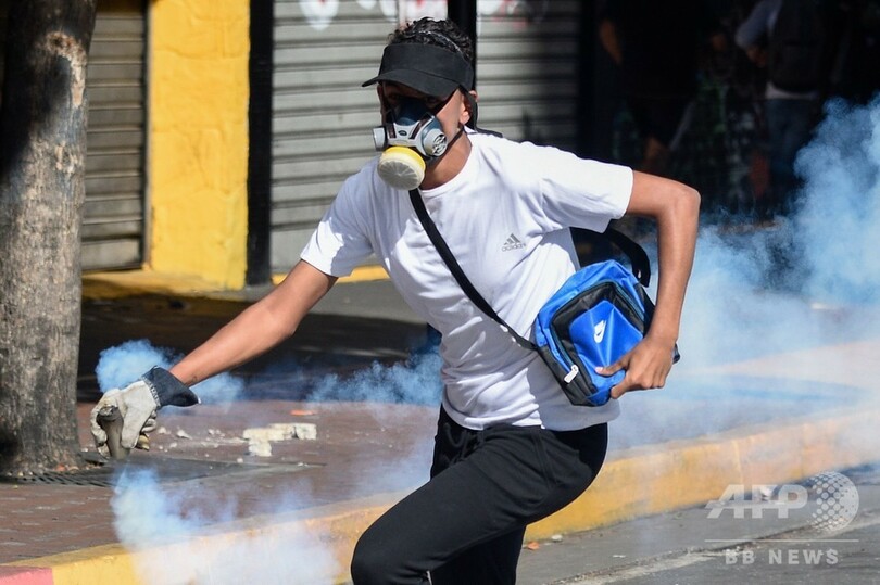 カラカス郊外では野党支持派のデモ隊に対し、警察の機動隊が催涙ガスとゴム弾を発射。テレビ映像によると、カラカス市内にも装甲車が投入された。(c)AFP/Maria Isabel SANCHEZ