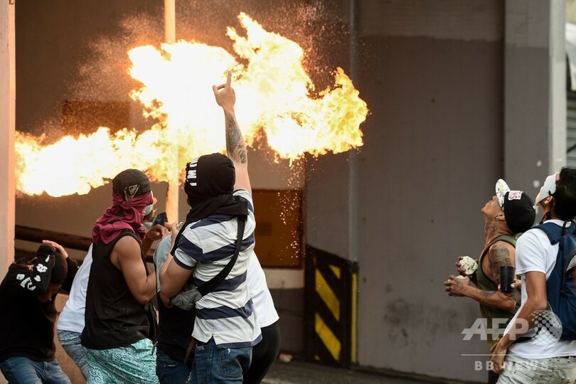 カラカス郊外では野党支持派のデモ隊に対し、警察の機動隊が催涙ガスとゴム弾を発射。テレビ映像によると、カラカス市内にも装甲車が投入された。(c)AFP/Maria Isabel SANCHEZ