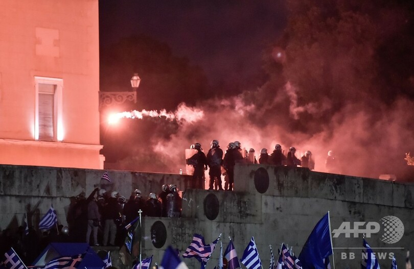 合意をめぐっては両国で抗議デモが行われており、時に衝突にも発展。ギリシャ議会前では25日、数十人が抗議を行った。ギリシャのスカイTV(SKAI TV)が24日夜発表した世論調査結果では、回答者の62%が合意に反対、支持は27%にとどまっている。(c)AFP/John HADOULIS