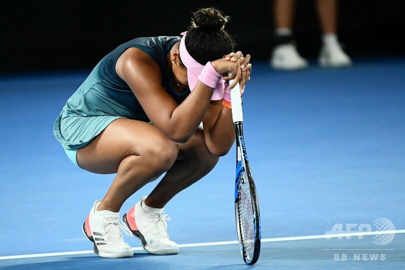 大坂は勝利が決まると膝をついて喜び、メルボルンパーク(Melbourne Park)に詰めかけたファンからの大歓声にお辞儀をして応えた。全米オープンの決勝では対戦相手のセレーナ・ウィリアムス(Serena Williams、米国)が主審と騒動を起こし、試合後に会場からブーイングが巻き起こると大坂は涙を流したが、この日はその時とは対照的に笑顔を見せ、喜びの涙をこぼした。(c)AFP