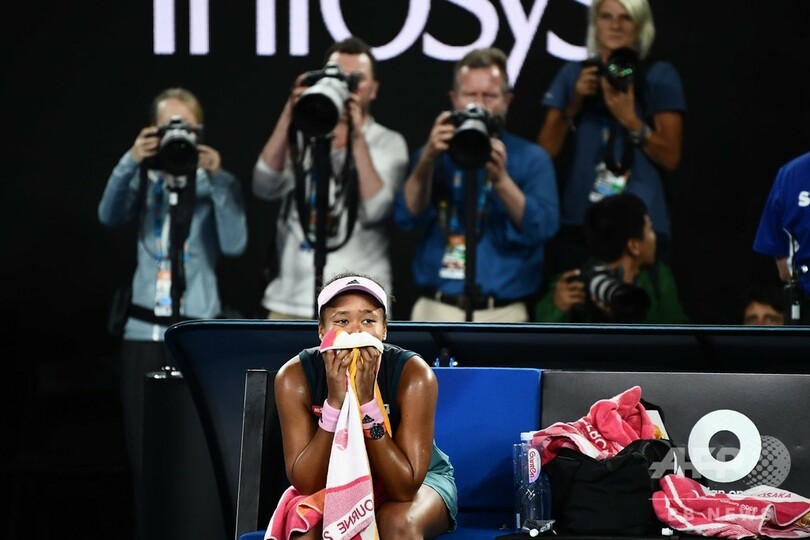 大坂は勝利が決まると膝をついて喜び、メルボルンパーク(Melbourne Park)に詰めかけたファンからの大歓声にお辞儀をして応えた。全米オープンの決勝では対戦相手のセレーナ・ウィリアムス(Serena Williams、米国)が主審と騒動を起こし、試合後に会場からブーイングが巻き起こると大坂は涙を流したが、この日はその時とは対照的に笑顔を見せ、喜びの涙をこぼした。(c)AFP