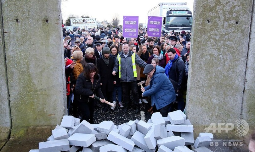 デモ参加者らはこの日、北アイルランドとアイルランドの500キロに及ぶ国境の管理復活を避けるよう英議会に求めた後、歓声を上げながら大型ハンマーを使い、設置した壁をたたき壊した。(c)AFP