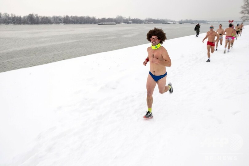 セルビア首都で寒中「下着ラン」、雪景色のドナウ川沿いを走る
