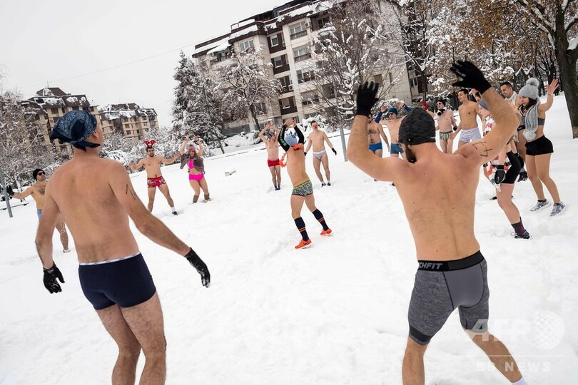 セルビア首都で寒中「下着ラン」、雪景色のドナウ川沿いを走る