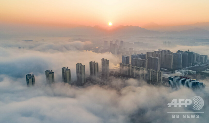 街の高層ビルは濃い雲に包まれ、朝の光に照らされて見え隠れする姿は、仙人の住む世界のように見えた。(c)CNS/JCM/AFPBB News