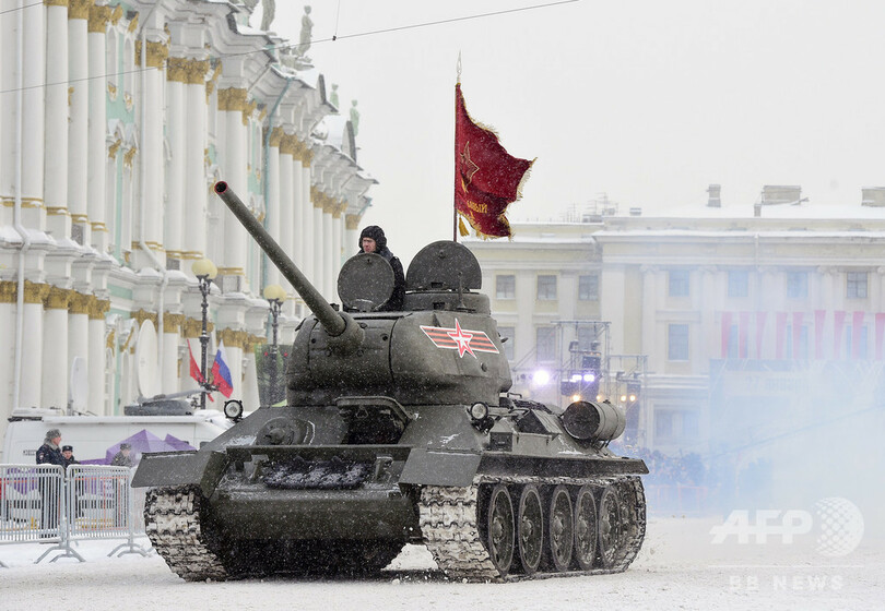 サンクトペテルブルク中心部の宮殿広場(Palace Square)では27日、戦車や防空ミサイルシステムによる軍事パレードが行われた。最新鋭兵器のほか第2次世界大戦中に名をはせたT34戦車も登場し、氷点下11度と冷え込む降雪の中、大勢の人々がパレードを見守った。