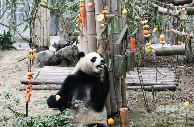 成都のパンダ基地で新春のイベント フルーツが盛りだくさん