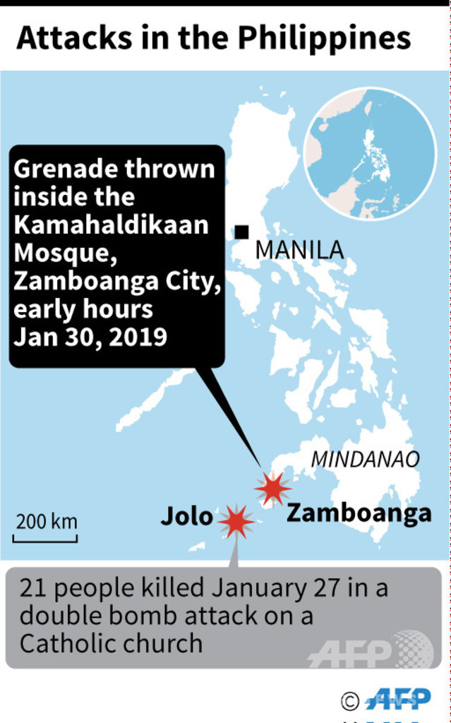 【1月30日 AFP】(更新、写真追加)フィリピン南部ミンダナオ(Mindanao)島のサンボアンガ(Zamboanga)市で30日未明、モスク(イスラム礼拝所)に手投げ弾が投げ込まれ、2人が死亡、4人が負傷した。地元の軍当局が発表した。犠牲者は当時、モスク内で寝ていたという。