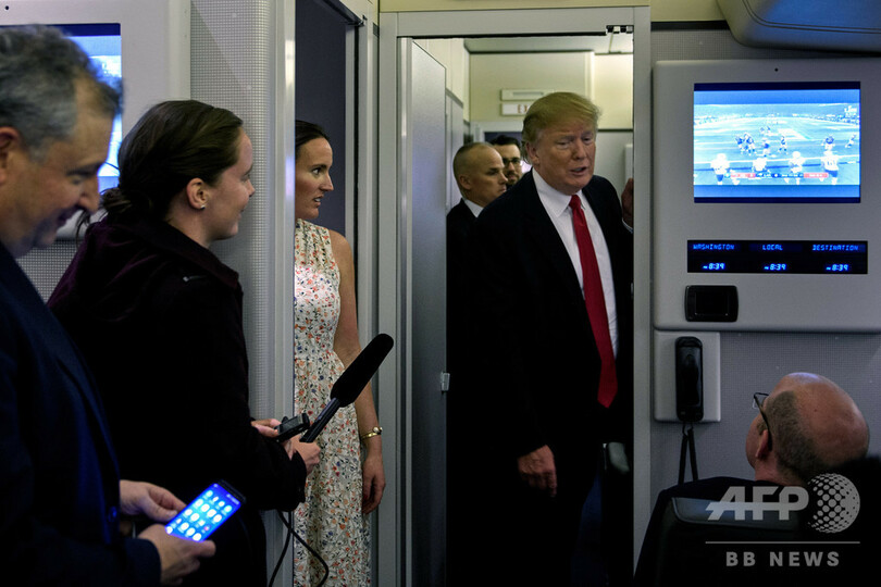 【2月5日 AFP】米大統領専用機エアフォースワン(Air Force One)の機内で、スーパーボウル(Super Bowl LIII)放送中、記者らに話しかけるドナルド・トランプ(Donald Trump)大統領。フロリダ州のパームビーチ国際空港(Palm Beach International Airport)で。(c)AFP