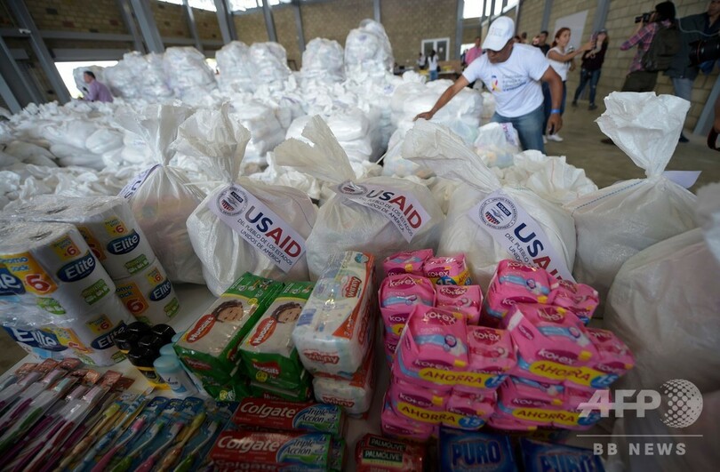 グアイド氏は米国からの食料や医薬品を受け入れようとしているが、ベネズエラ軍がコロンビアとの国境で搬入を妨害しているため、物資はコロンビア側の倉庫に滞留している。(c)AFP