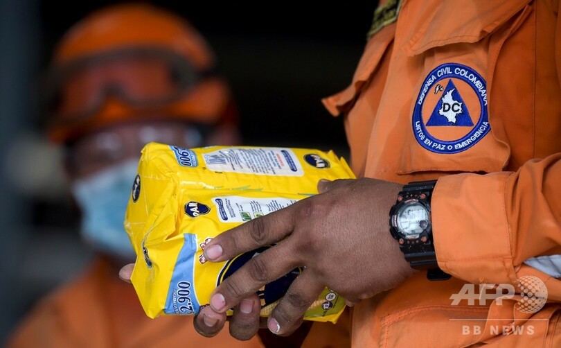 グアイド氏は米国からの食料や医薬品を受け入れようとしているが、ベネズエラ軍がコロンビアとの国境で搬入を妨害しているため、物資はコロンビア側の倉庫に滞留している。(c)AFP