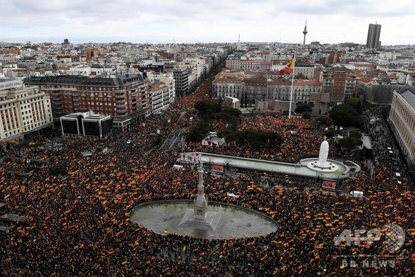 【2月11日 AFP】スペインの首都マドリードで10日、ペドロ・サンチェス(Pedro Sanchez)首相のカタルーニャ(Catalonia)政策に抗議する集会が右派や極右政党の呼び掛けで開かれ、警察発表で4万5000人、主催者発表で20万人以上がコロン広場(Colon Square)とその周辺道路を埋め尽くした。