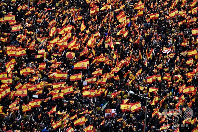 【2月11日 AFP】スペインの首都マドリードで10日、ペドロ・サンチェス(Pedro Sanchez)首相のカタルーニャ(Catalonia)政策に抗議する集会が右派や極右政党の呼び掛けで開かれ、警察発表で4万5000人、主催者発表で20万人以上がコロン広場(Colon Square)とその周辺道路を埋め尽くした。