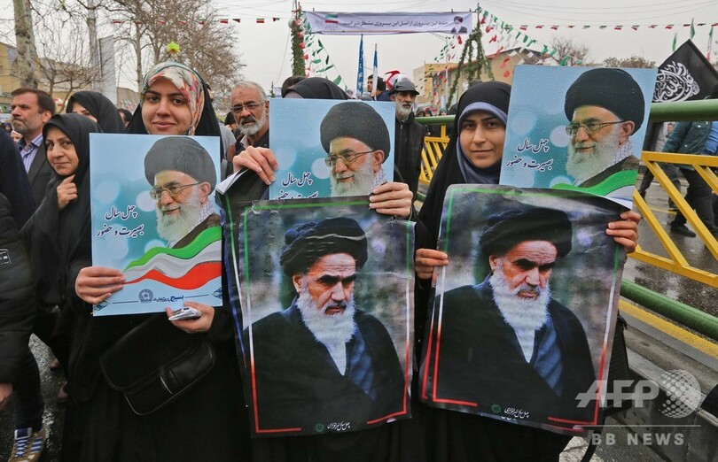 故ルホラ・ホメイニ(Ruhollah Khomeini)師が長年続いた王制を終わらせた1979年2月11日から40年経ったこの日、テヘランでは凍えるような冷たい雨が降る中、チャドル(イスラム教徒の女性が着用するマント)をまとった女性や、迷彩服姿の民兵、一般市民らが行進した。