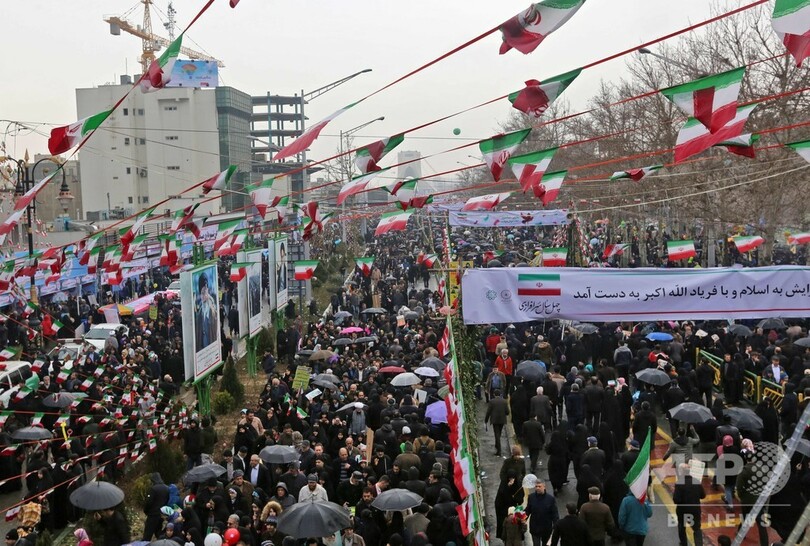 故ルホラ・ホメイニ(Ruhollah Khomeini)師が長年続いた王制を終わらせた1979年2月11日から40年経ったこの日、テヘランでは凍えるような冷たい雨が降る中、チャドル(イスラム教徒の女性が着用するマント)をまとった女性や、迷彩服姿の民兵、一般市民らが行進した。