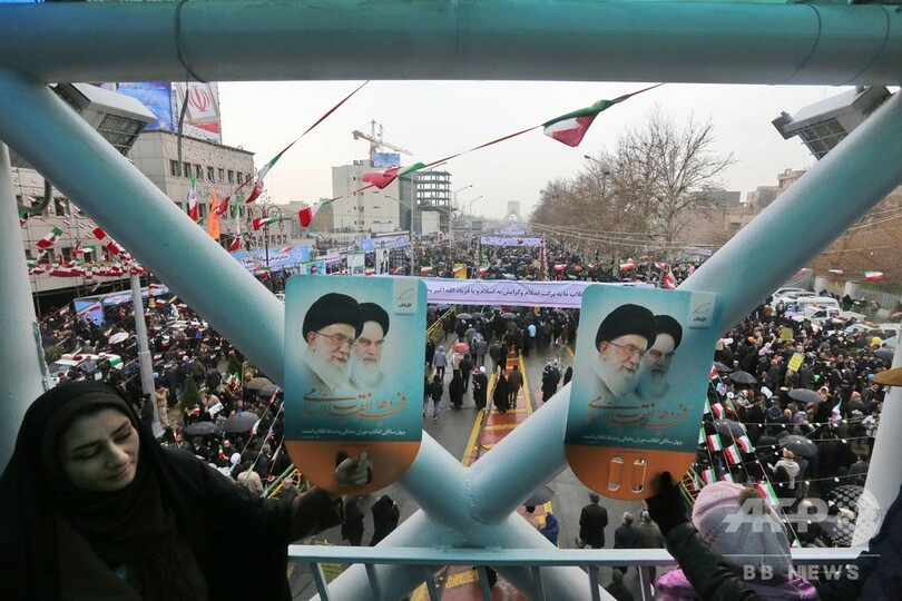 故ルホラ・ホメイニ(Ruhollah Khomeini)師が長年続いた王制を終わらせた1979年2月11日から40年経ったこの日、テヘランでは凍えるような冷たい雨が降る中、チャドル(イスラム教徒の女性が着用するマント)をまとった女性や、迷彩服姿の民兵、一般市民らが行進した。