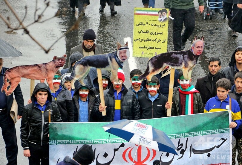 故ルホラ・ホメイニ(Ruhollah Khomeini)師が長年続いた王制を終わらせた1979年2月11日から40年経ったこの日、テヘランでは凍えるような冷たい雨が降る中、チャドル(イスラム教徒の女性が着用するマント)をまとった女性や、迷彩服姿の民兵、一般市民らが行進した。
