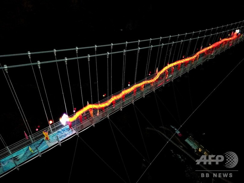 竜がつり橋駆け抜けた? 福建・ガラスのつり橋の上で新春祝い