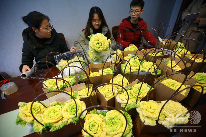 【2月16日 CNS】中国・南京市(Nanjing)南京農業大学(Nanjing Agricultural University)園芸学院(College of Horticulture)の学生らが、「バラ白菜」の梱包作業をしている。