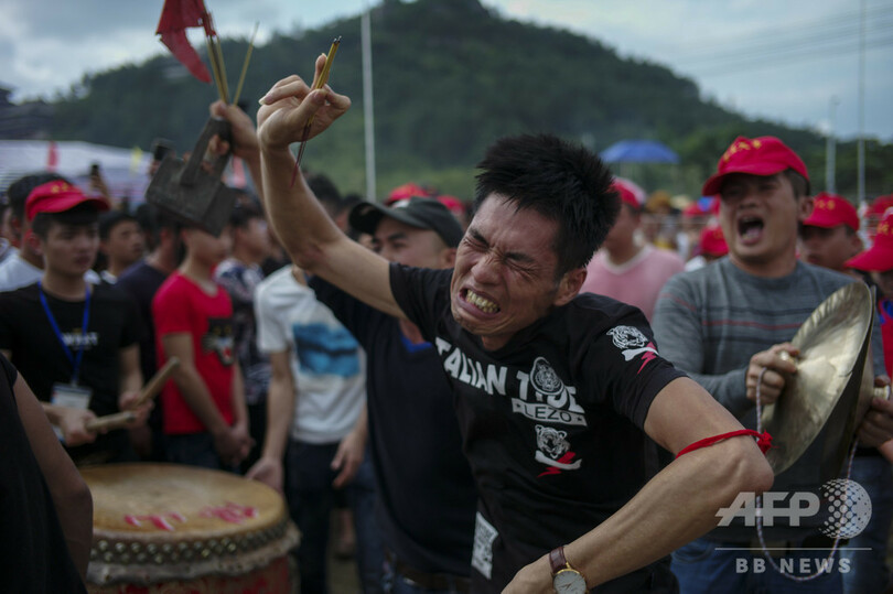 【2月18日 CNS】中国・海南省(Hainan)の文筆峰(Wenbifeng)盤古文化旅行区で13日、海南島各地から集まった12組の演者らが、1300年の歴史を持つ棒を頬に通すパフォーマンス「穿杖(Chuanzhang)」を披露した。(c)CNS/JCM/AFPBB News
