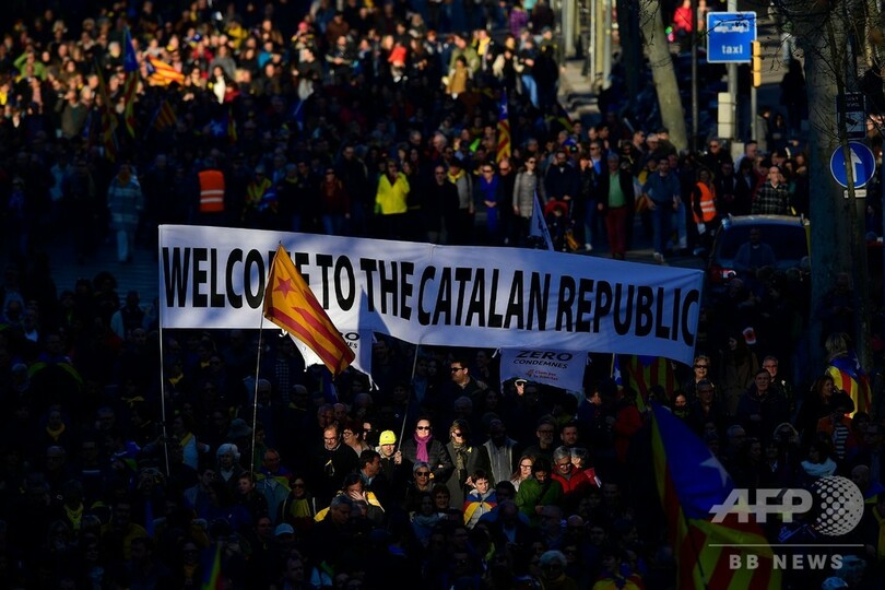 【2月17日 AFP】(更新)スペインの首都マドリードでカタルーニャ(Catalonia)自治州の独立支持派元指導者の公判が12日に開廷したことを受けて、同州の州都バルセロナで16日、この公判に抗議するデモ行進が行われた。バルセロナ市警によると、デモにはおよそ20万人が参加した。