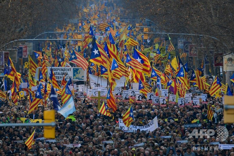 【2月17日 AFP】(更新)スペインの首都マドリードでカタルーニャ(Catalonia)自治州の独立支持派元指導者の公判が12日に開廷したことを受けて、同州の州都バルセロナで16日、この公判に抗議するデモ行進が行われた。バルセロナ市警によると、デモにはおよそ20万人が参加した。
