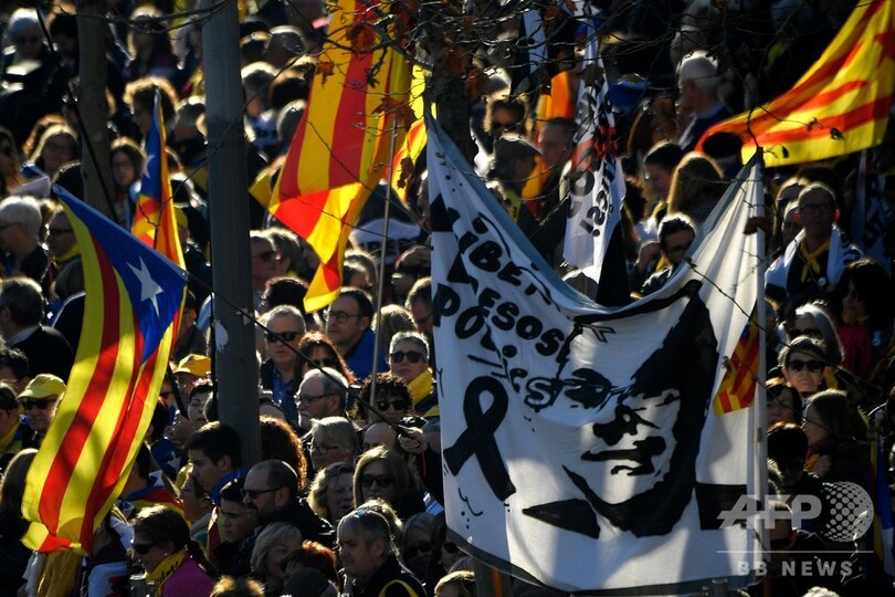 【2月17日 AFP】(更新)スペインの首都マドリードでカタルーニャ(Catalonia)自治州の独立支持派元指導者の公判が12日に開廷したことを受けて、同州の州都バルセロナで16日、この公判に抗議するデモ行進が行われた。バルセロナ市警によると、デモにはおよそ20万人が参加した。