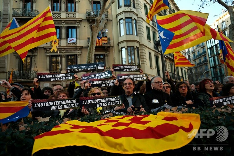 【2月17日 AFP】(更新)スペインの首都マドリードでカタルーニャ(Catalonia)自治州の独立支持派元指導者の公判が12日に開廷したことを受けて、同州の州都バルセロナで16日、この公判に抗議するデモ行進が行われた。バルセロナ市警によると、デモにはおよそ20万人が参加した。
