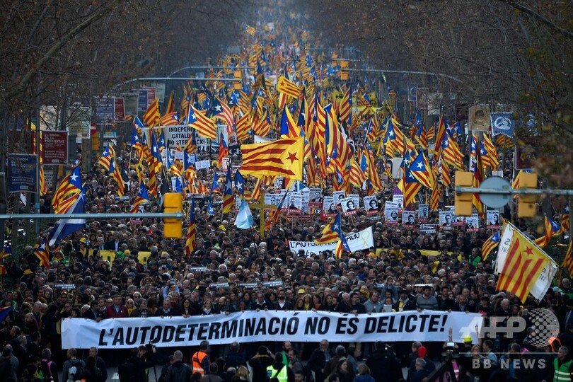 【2月17日 AFP】(更新)スペインの首都マドリードでカタルーニャ(Catalonia)自治州の独立支持派元指導者の公判が12日に開廷したことを受けて、同州の州都バルセロナで16日、この公判に抗議するデモ行進が行われた。バルセロナ市警によると、デモにはおよそ20万人が参加した。