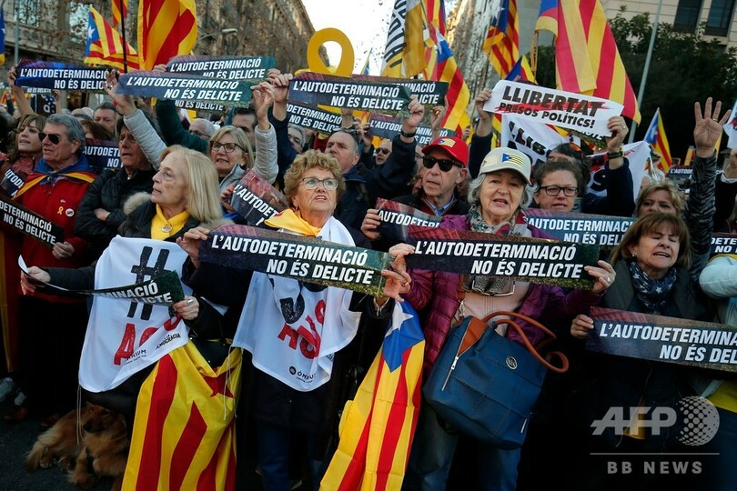 【2月17日 AFP】(更新)スペインの首都マドリードでカタルーニャ(Catalonia)自治州の独立支持派元指導者の公判が12日に開廷したことを受けて、同州の州都バルセロナで16日、この公判に抗議するデモ行進が行われた。バルセロナ市警によると、デモにはおよそ20万人が参加した。