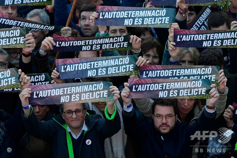【2月17日 AFP】(更新)スペインの首都マドリードでカタルーニャ(Catalonia)自治州の独立支持派元指導者の公判が12日に開廷したことを受けて、同州の州都バルセロナで16日、この公判に抗議するデモ行進が行われた。バルセロナ市警によると、デモにはおよそ20万人が参加した。