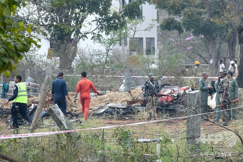 2機はインド空軍のアクロバット飛行隊「スーリヤ・キラン(Surya Kiran)」所属機で、ベンガルールで20日開幕する航空ショー「エアロ・インディア(Aero India)」の初日にアクロバット飛行を行う予定だった。(c)AFP