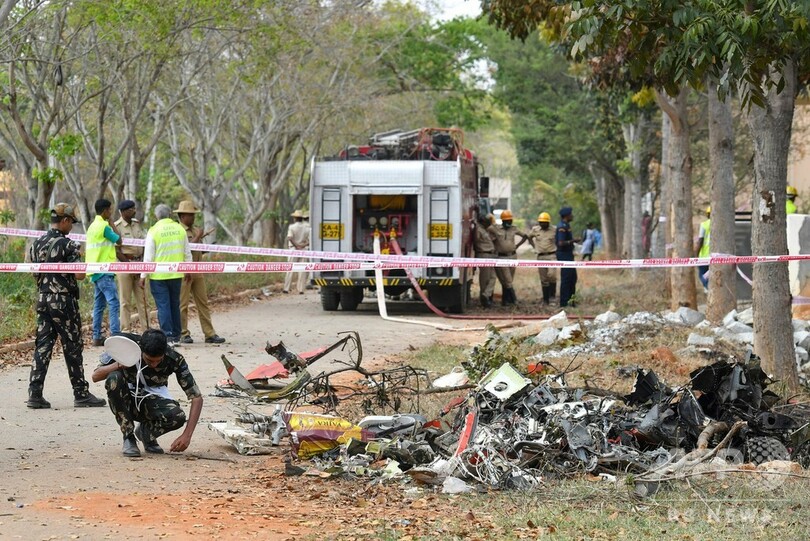 2機はインド空軍のアクロバット飛行隊「スーリヤ・キラン(Surya Kiran)」所属機で、ベンガルールで20日開幕する航空ショー「エアロ・インディア(Aero India)」の初日にアクロバット飛行を行う予定だった。(c)AFP