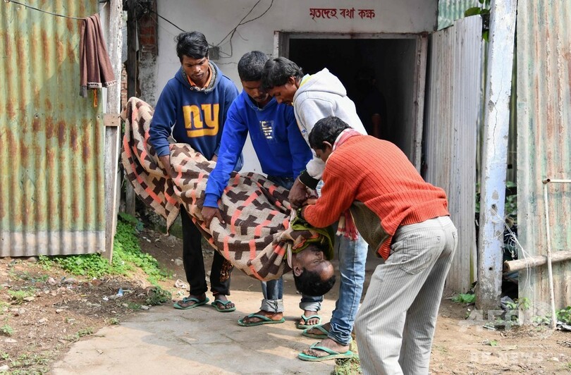 インド北東部アッサム州ゴラガート県の病院で、密造酒による犠牲者の遺体を運ぶ村人たち(2019年2月23日撮影)。(c)AFP/Biju BORO