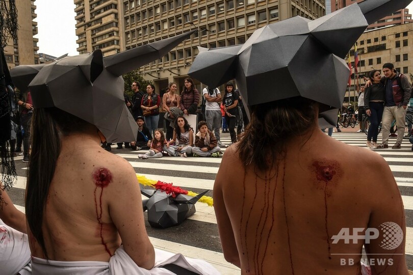 「殺さないで」、上半身裸で闘牛廃止訴え コロンビア