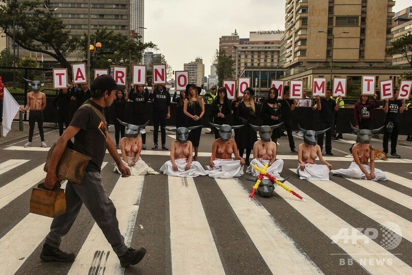 「殺さないで」、上半身裸で闘牛廃止訴え コロンビア
