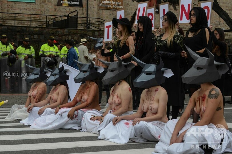 「殺さないで」、上半身裸で闘牛廃止訴え コロンビア
